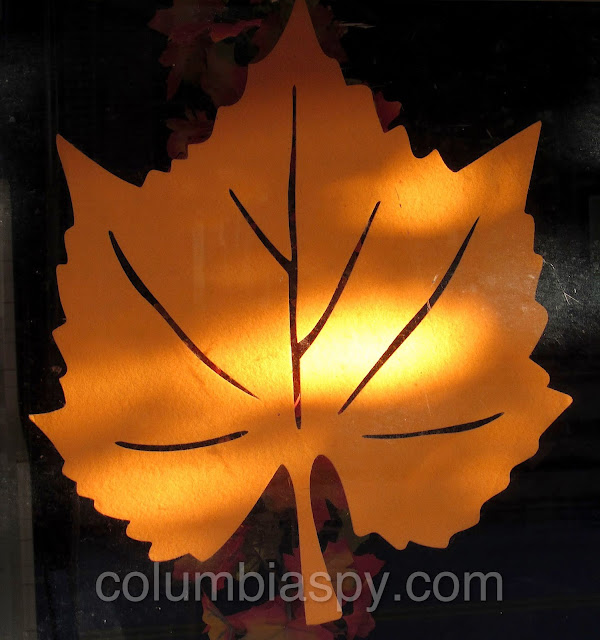 A surefire way to tell fall is on the way: a leaf cutout in a window