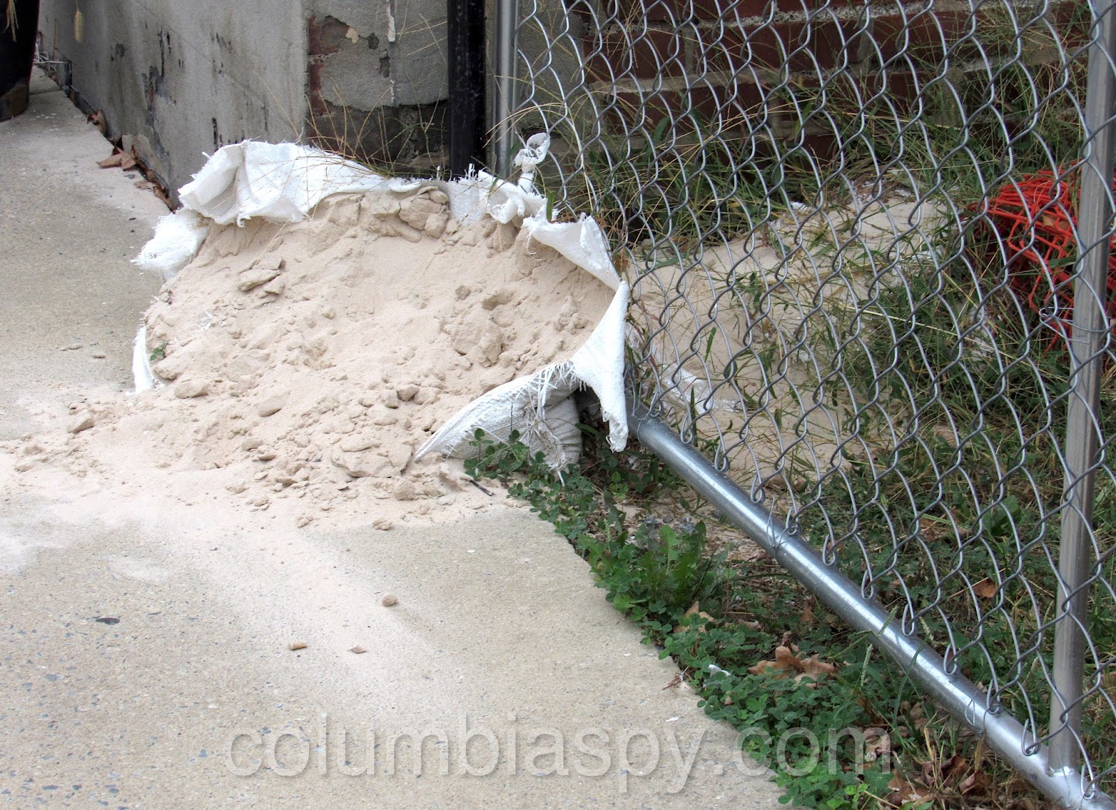 This sandbag was helping keep the temporary fence in place at 4th & Locust, but now its contents are spreading over the sidewalk.