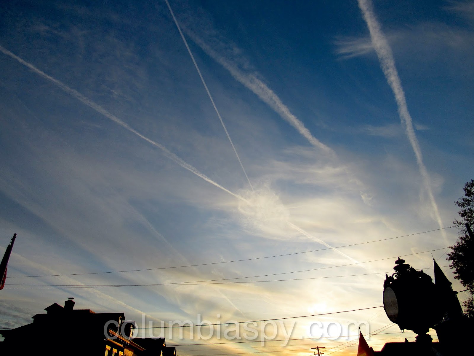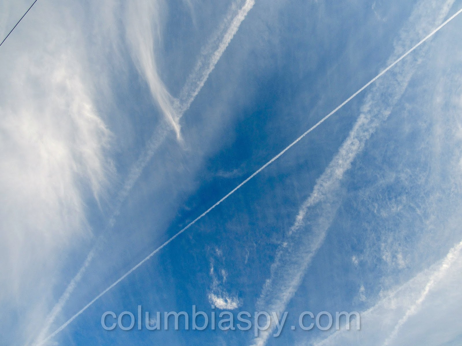 Contrail-riddled sky. (No, the government isn’t trying to kill us – at least not like this.)