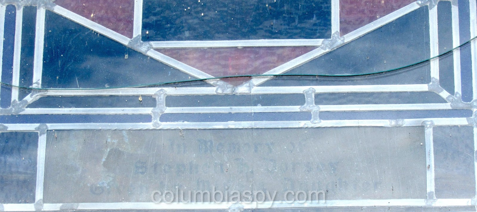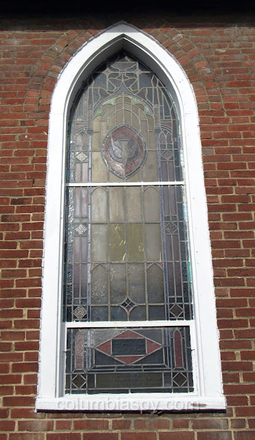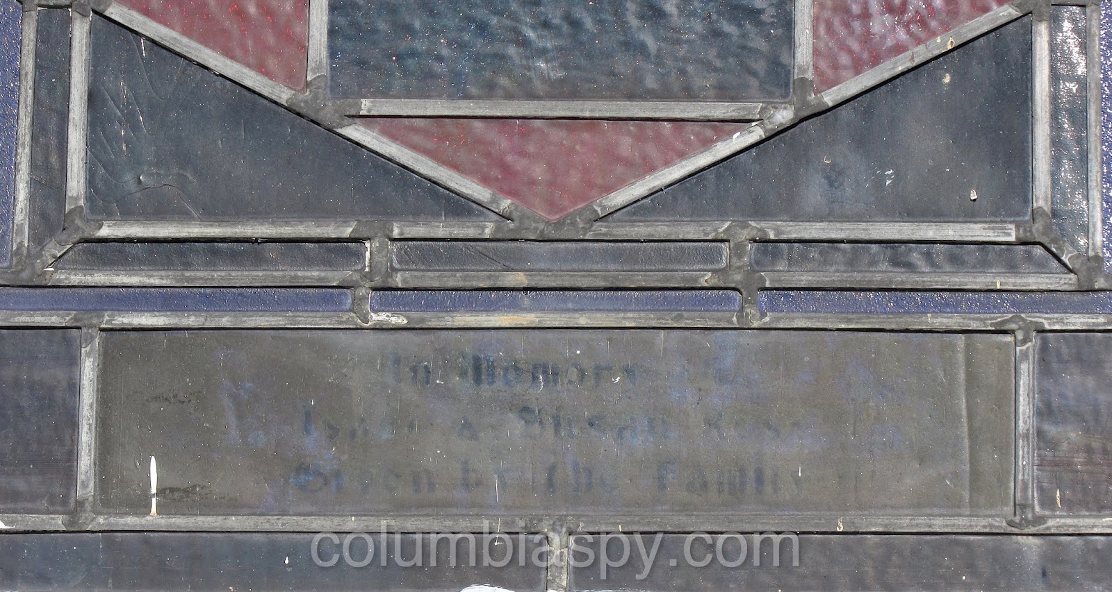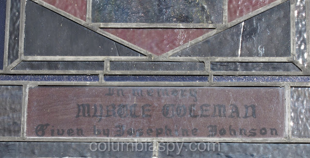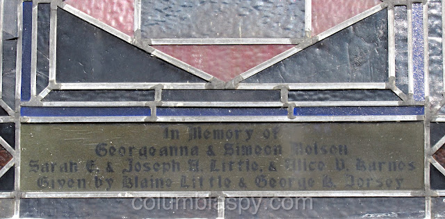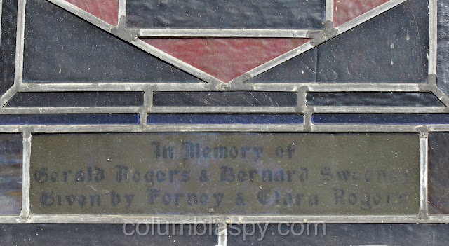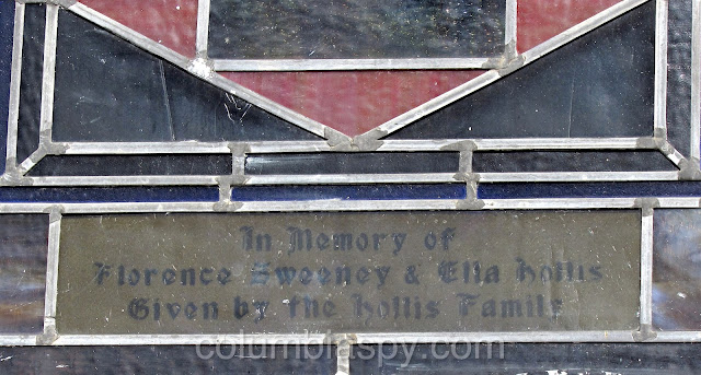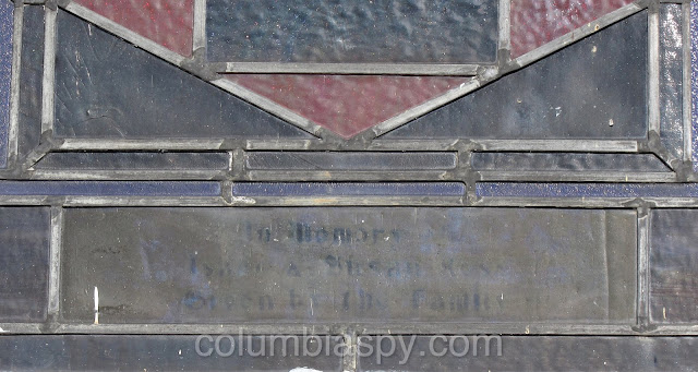 There are several unique stained glass windows, each with a memorial tribute, as shown below.