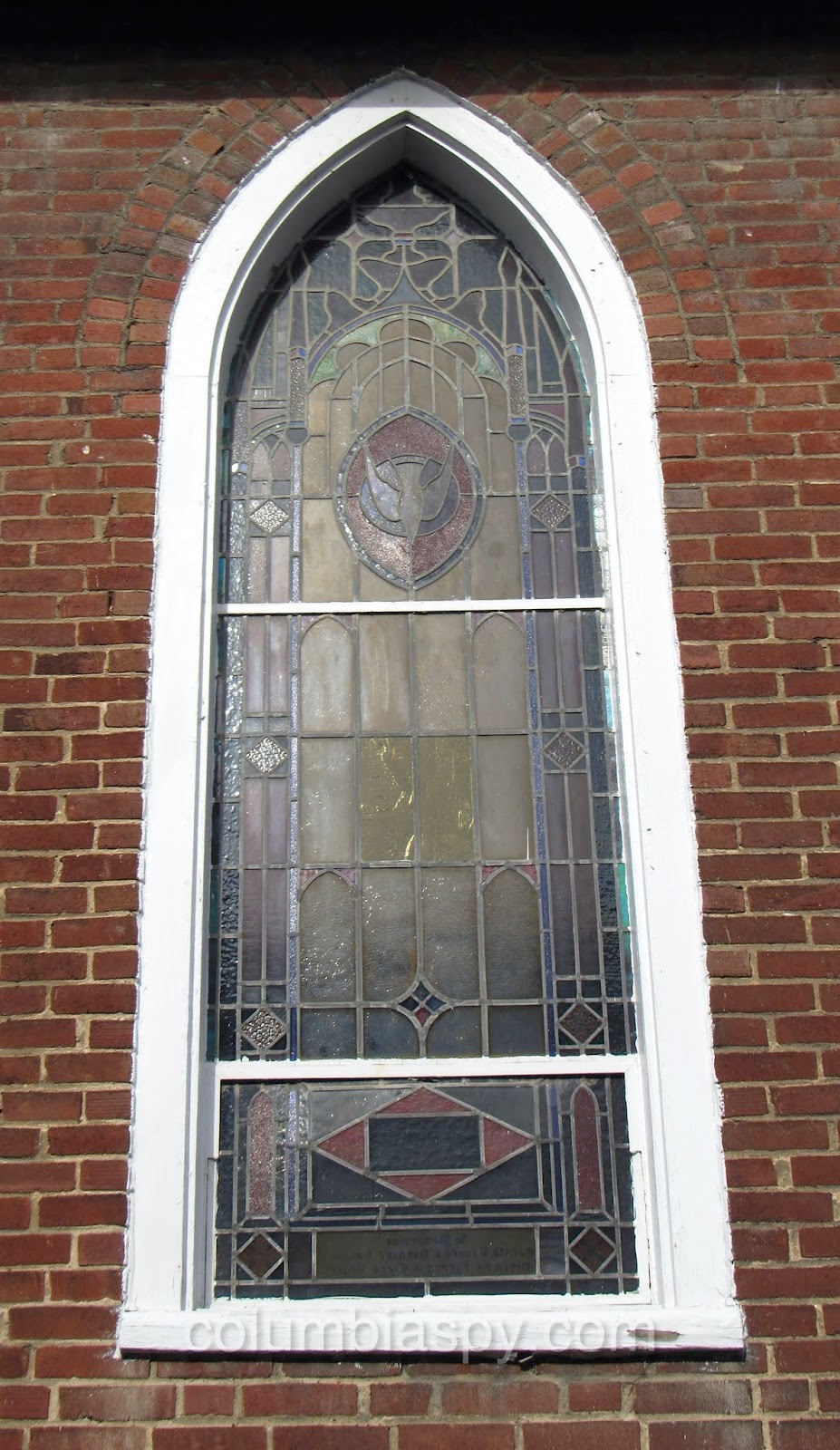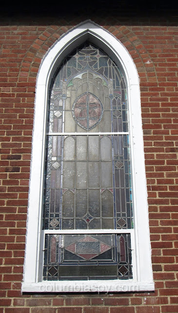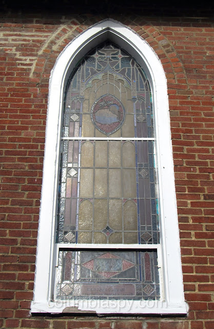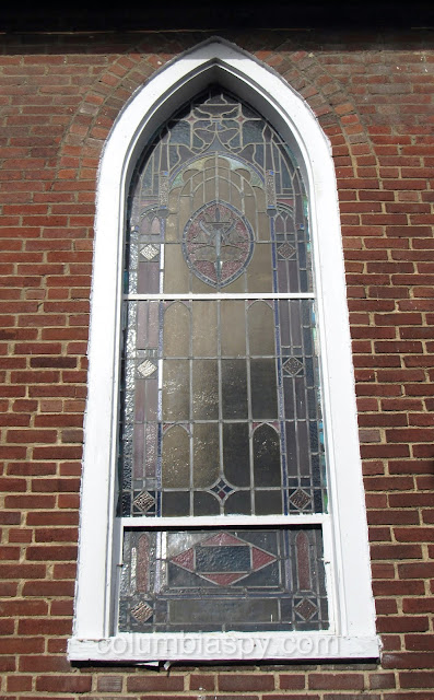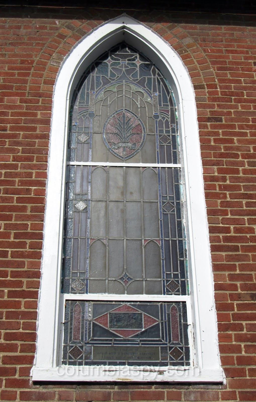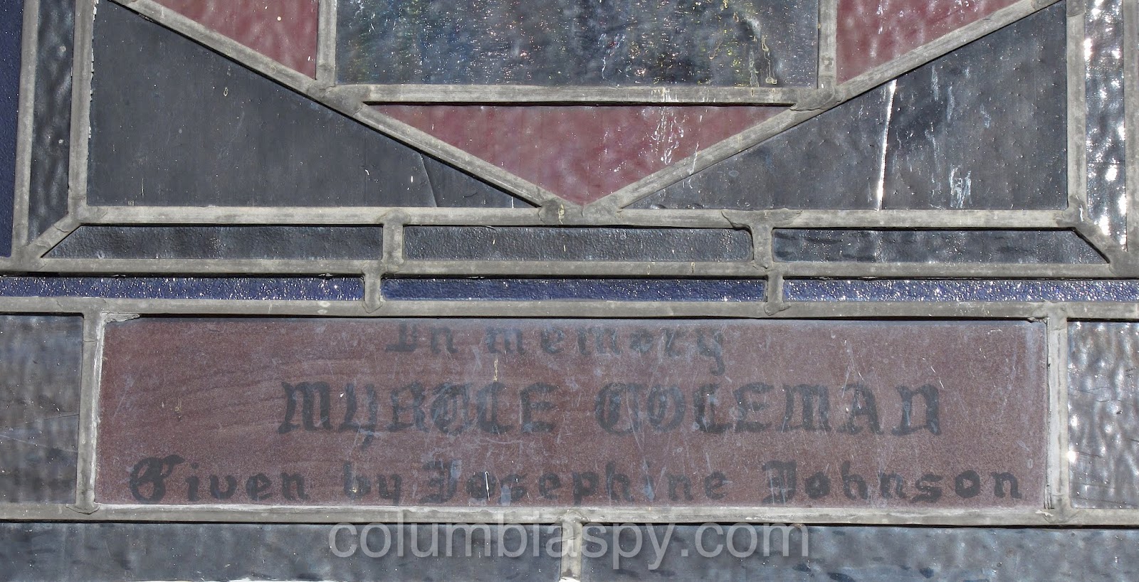 There are several unique stained glass windows, each with a memorial tribute, as shown below.