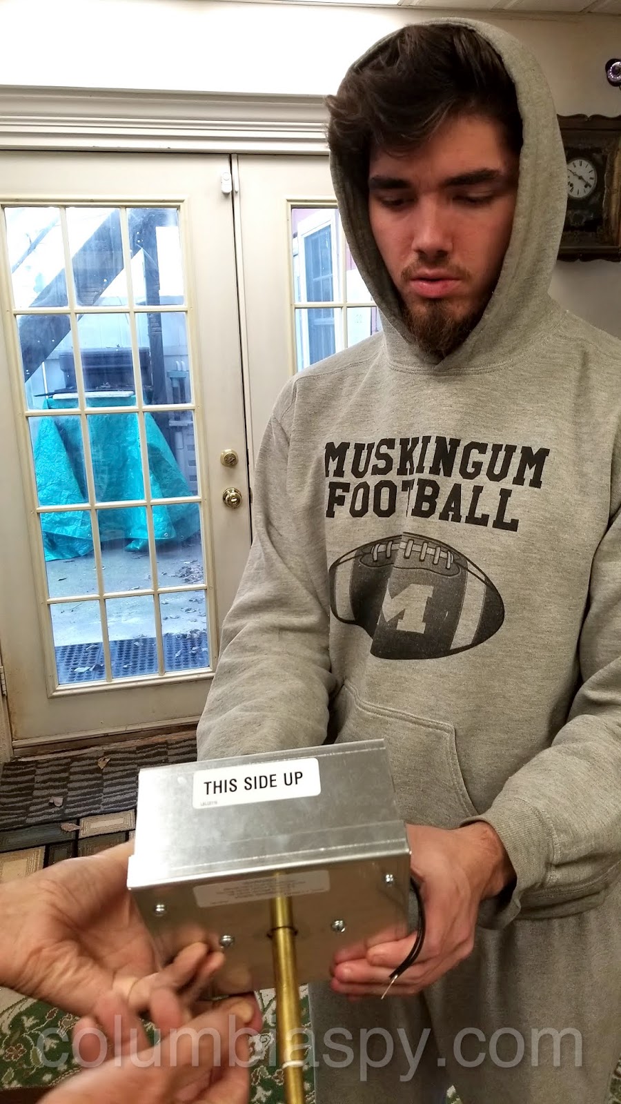 Cody holds a state-of-the-art “movement,” which drives the clock hands. When installed, the movement shaft will fit through a delrin bearing and will self-adjust. The bearing was made at Stevens Trade.