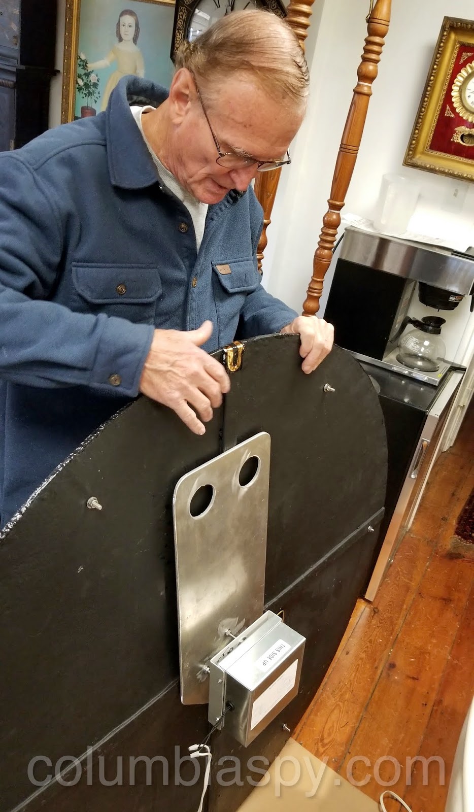 Laird shows a specially made metal plate to facilitate lifting the clocks to the tower. An installed movement can be seen near the bottom.