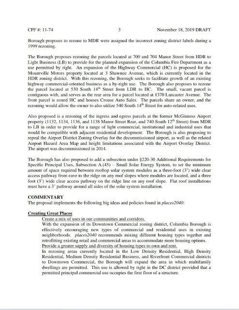 Columbia Spy has obtained an internal memorandum (shown below) of the Lancaster County Planning Commission, which is a “staff draft of a review scheduled for discussion and action” at the commission’s November 25, 2019 meeting. The memorandum lays out details of Columbia Borough’s proposed changes to its Zoning Ordinance Map and text amendments. The map is the foundation of the borough’s rezoning initiative, currently underway.