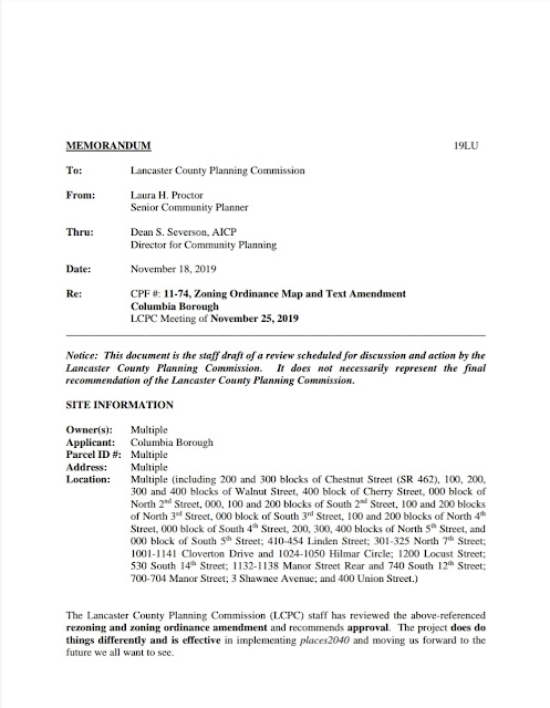 Columbia Spy has obtained an internal memorandum (shown below) of the Lancaster County Planning Commission, which is a “staff draft of a review scheduled for discussion and action” at the commission’s November 25, 2019 meeting. The memorandum lays out details of Columbia Borough’s proposed changes to its Zoning Ordinance Map and text amendments. The map is the foundation of the borough’s rezoning initiative, currently underway.