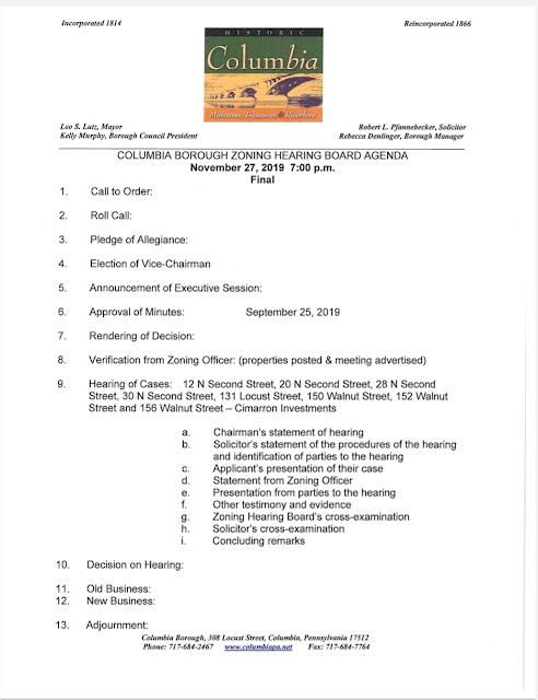 Agenda – Columbia Borough Zoning Hearing Board – November 27, 2019 Share this: Share on X (Opens in new window) X Share on Facebook (Opens in new window) Facebook More Share on Bluesky (Opens in new window) Bluesky Share on X (Opens in new window) X Like Loading... Related