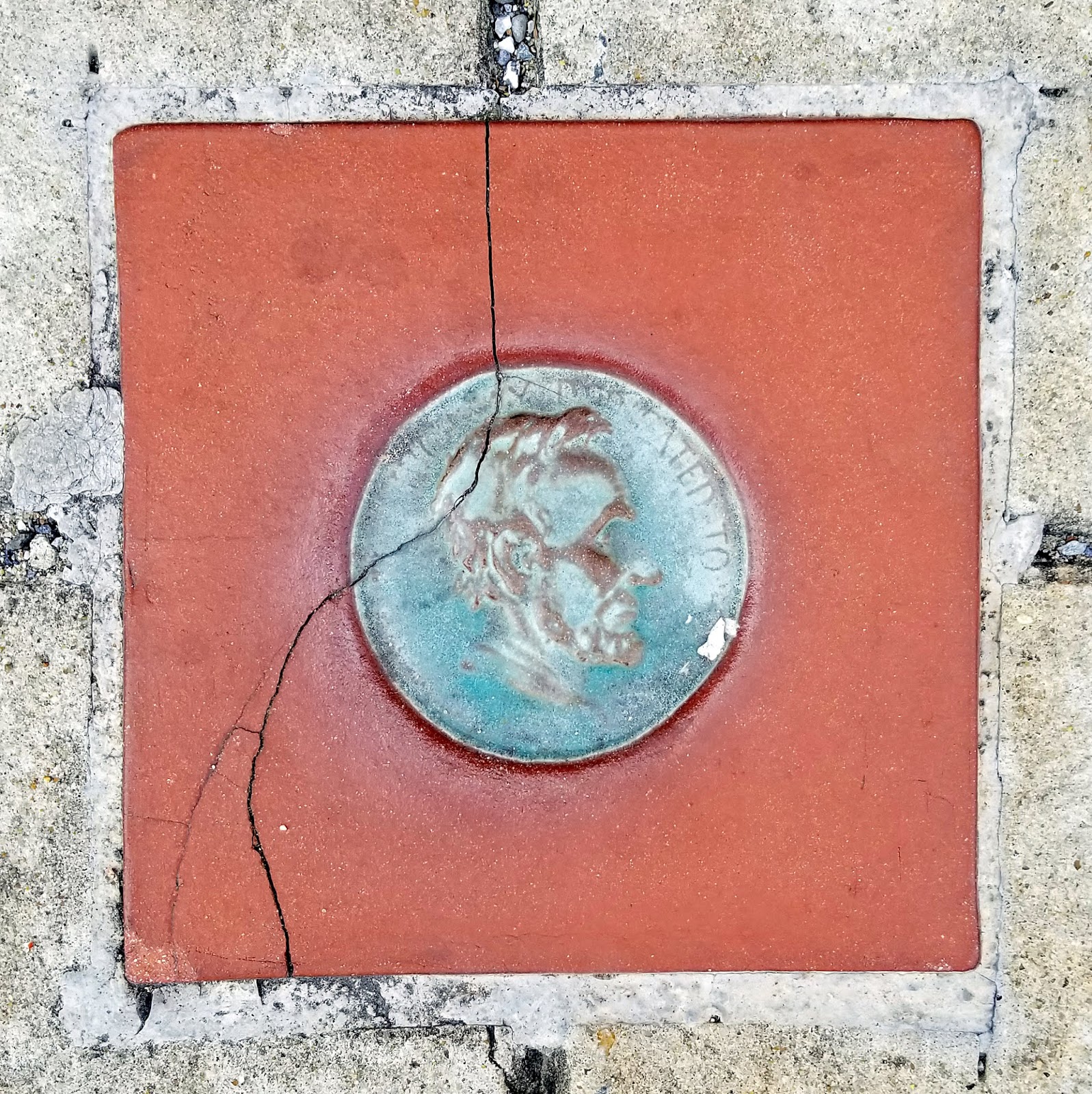 A cracked Abraham Lincoln sidewalk insert. Some people believe that Trump is a better president than Lincoln.