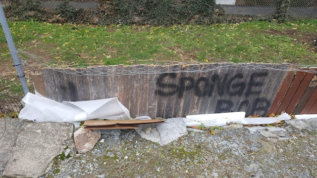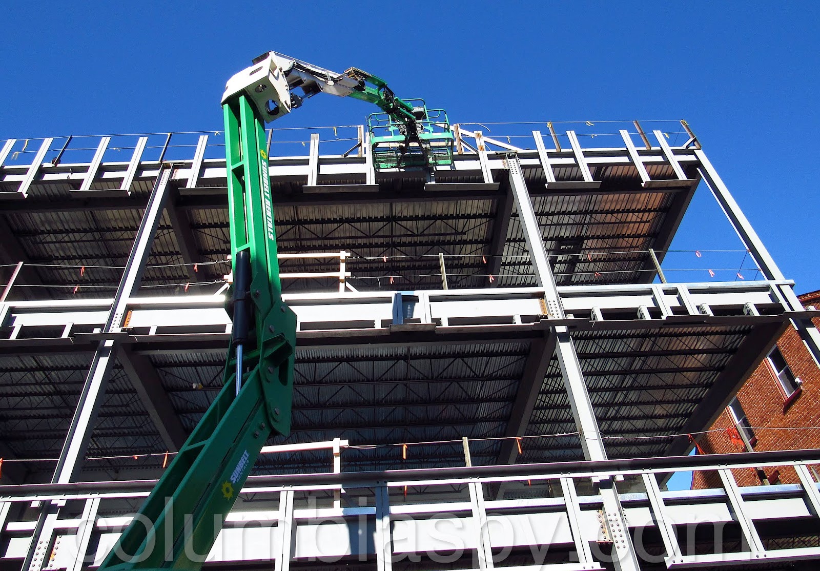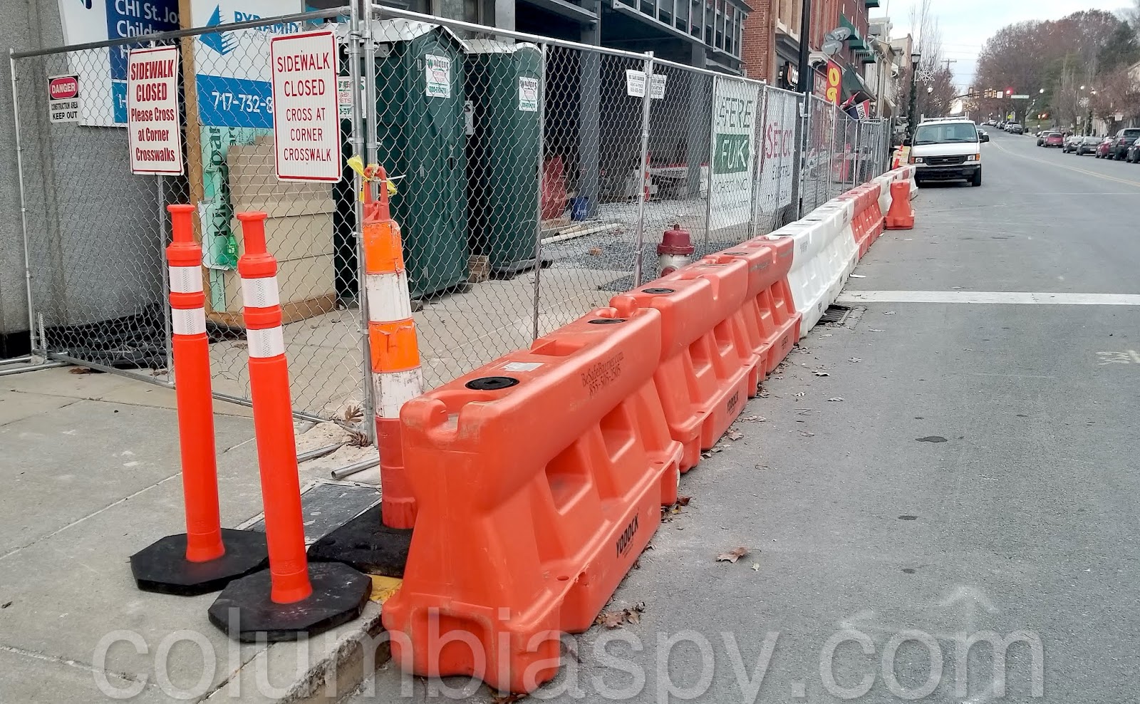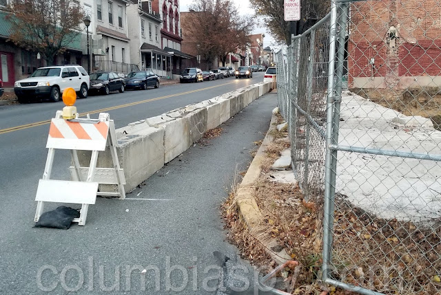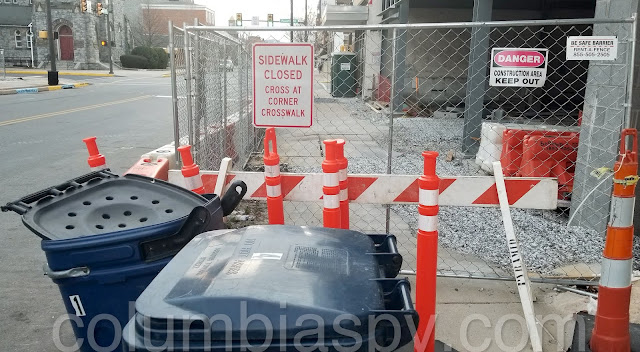 The concrete barriers here were placed due to a planned construction project that has apparently failed. Construction projects do that sometimes. The excavated area, which is now affectionately known as “The Hole” by Columbia residents, was to become an apartment building, as