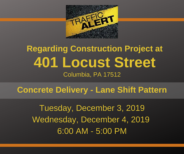 Pyramid Construction is planning to pump concrete to the roof and floor pans of the new building at 401 Locust Street on Tuesday/Wednesday, December 3-4, 2019, between the hours of 6:00 AM and 5:00 PM. The intended timeline is two (2) days, weather permitting. Thursday, December 5, will be a contingency day if weather impacts scheduled work. Multiple concrete trucks will rotate in front of the building feeding the pump. A lane-shift pattern will allow traffic to flow in both directions with Flagger Force personnel directing the flow of traffic at the lane shift during the entire work day(s).