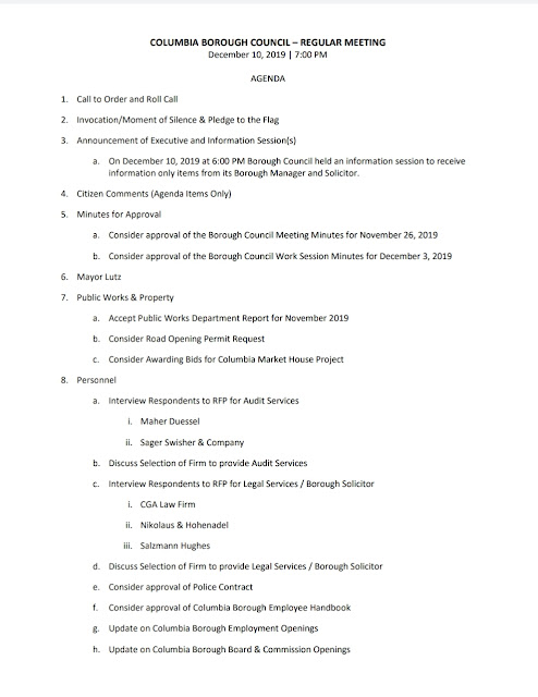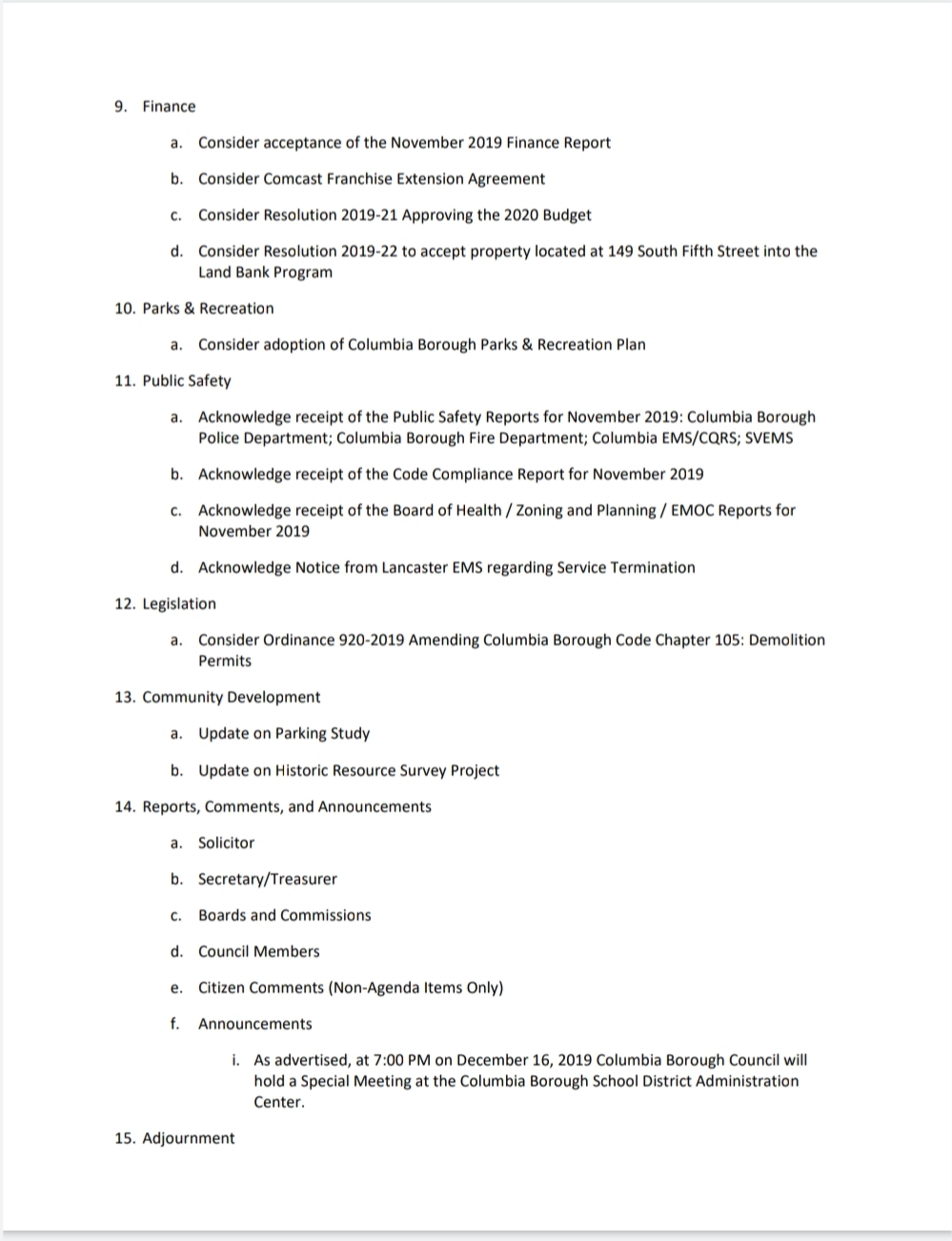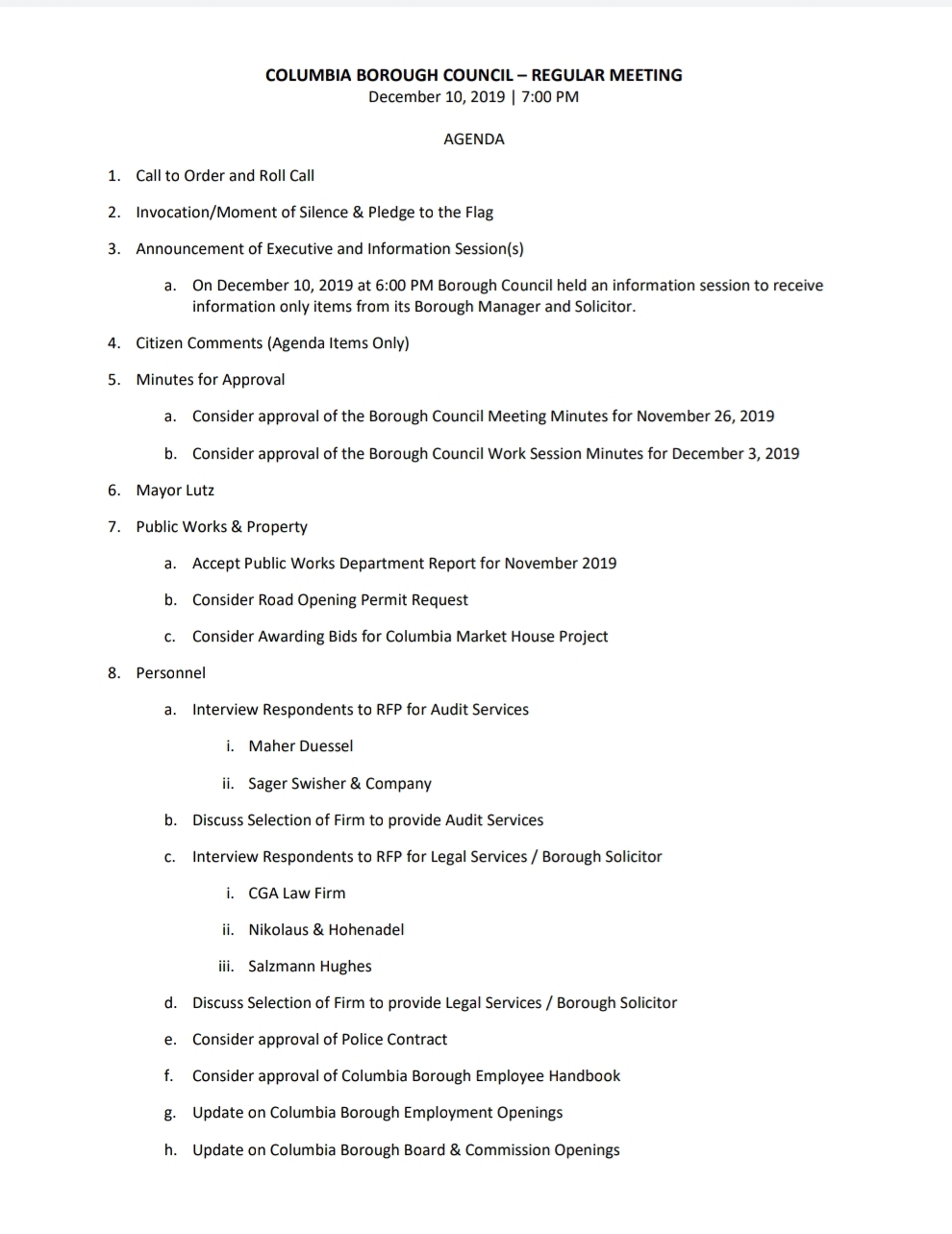 Agenda – Columbia Borough Council Meeting – December 10, 2019 Download the council packet HERE. Download the November 2019 Finance Reports HERE. Share this: Share on X (Opens in new window) X Share on Facebook (Opens in new window) Facebook More Share on Bluesky (Opens in new window) Bluesky Share on X (Opens in new window) X Like Loading... Related