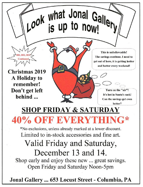40% off everything at Jonal Gallery December 13 & 14 Share this: Share on X (Opens in new window) X Share on Facebook (Opens in new window) Facebook More Share on Bluesky (Opens in new window) Bluesky Share on X (Opens in new window) X Like Loading... Related