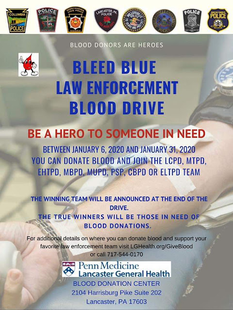 Bleed Blue Law Enforcement Blood Drive to be held January 13 The blood drive will be held January 13 from 9 a.m. to 2 p.m. at the Columbia Borough Fire Department on Manor Street. Share this: Share on X (Opens in new window) X Share on Facebook (Opens in new window) Facebook More Share on Bluesky (Opens in new window) Bluesky Share on X (Opens in new window) X Like Loading... Related