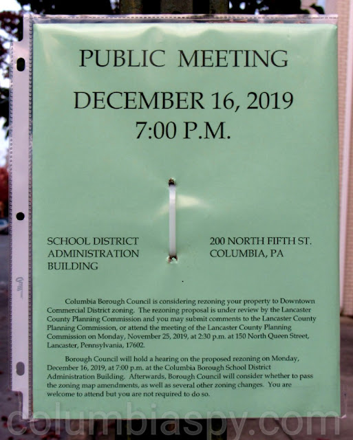 Notice is hereby given that the Ordinance summarized below will be considered by Borough Council of the Borough of Columbia for adoption following a zoning hearing pursuant to the Pennsylvania Municipalities Planning Code to be held at a special meeting of Council on Monday, December 16, 2019, at 7:00 p.m. in Columbia Borough School District’s Administration Building located at 200 North Fifth Street, Columbia, Pennsylvania: An Ordinance to repeal the Airport District Overlay, including deletion of the Airport Hazard Area Map and height limitations associated with the Airport Overlay District; to include a provision for space between rooftop solar panels; to amend the official zoning map of the Borough of Columbia to designate certain areas presently designated High Density Residential (HDR), Medium Density Residential Business (MDRB), and Riverfront Commercial (RC) to Downtown Commercial (DC); to change the area known as the Linden Street Gateway from Low Density Residential (LDR) to Downtown Commercial (DC) District; to change 301?325 North Seventh Street from Medium Density Residential (MDR) to Institutional/?Residential (INSR) District; to change Cloverton Drive west of Kinderhook Road and Hilmar Circle from Rural Residential (RR) to Medium Density Residential (MDR) District; to change the 1200 block of Locust Street from Rural Residential (RR) to Institutional/?Residential (INSR) District; to change 530 South Fourteenth Street from Low Density Residential (LDR) to Highway Commercial (HC) District; to change the zoning of certain parcels on the 1100 block of Manor Street as well as 740 South Twelfth Street from Medium Density Residential (MDR) to Light Business (LB) District; to change 700, 704, and 706 Manor Street from High Density Residential (HDR) to Light Business (LB) District; to change the properties located at 3 Shawnee Avenue, 622 Union Street, and 600 Avenue N from High Density Residential (HDR) to Highway Commercial (HC) District; to change 400 Union Street from High Density Residential (HDR) to High Density Residential – Multi-Unit (HDRM) District; providing for the repeal of inconsistent ordinances; providing for the severability of the ordinance; and providing that the ordinance shall take effect in accordance with Pennsylvania law. A complete copy of the Ordinance may be inspected at the Municipal Building, 308 Locust Street, Columbia, PA during regular business hours and the Lancaster Law Library, located at 50 North Duke Street, Lancaster, Pennsylvania during regular business hours.