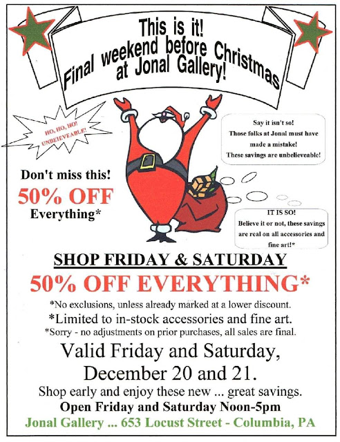 50% off everything at Jonal Gallery – December 20 & 21 Share this: Share on X (Opens in new window) X Share on Facebook (Opens in new window) Facebook More Share on Bluesky (Opens in new window) Bluesky Share on X (Opens in new window) X Like Loading... Related