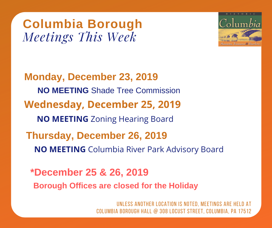 Columbia Borough Meetings – Week of December 23, 2019 Share this: Share on X (Opens in new window) X Share on Facebook (Opens in new window) Facebook More Share on Bluesky (Opens in new window) Bluesky Share on X (Opens in new window) X Like Loading... Related