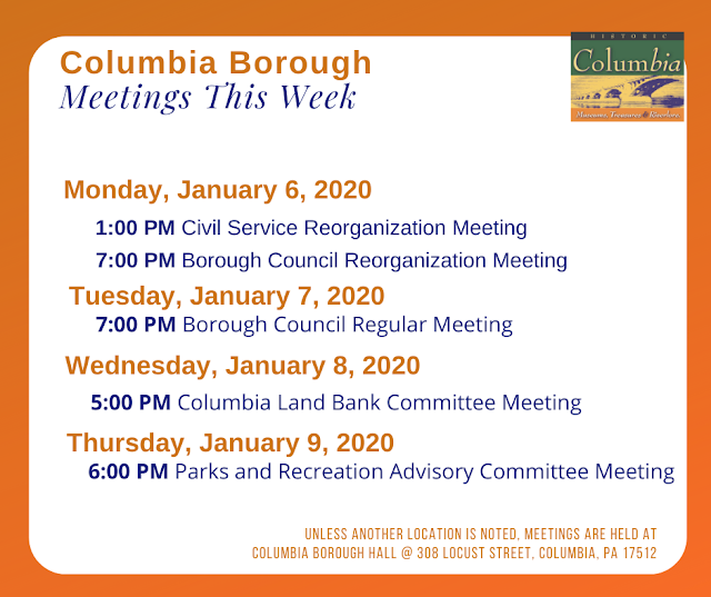 Columbia Borough Meetings – Week of January 6, 2020 Share this: Share on X (Opens in new window) X Share on Facebook (Opens in new window) Facebook More Share on Bluesky (Opens in new window) Bluesky Share on X (Opens in new window) X Like Loading... Related