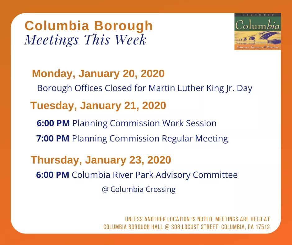 Columbia Borough Meetings – Week of January 20, 2020 Share this: Share on X (Opens in new window) X Share on Facebook (Opens in new window) Facebook More Share on Bluesky (Opens in new window) Bluesky Share on X (Opens in new window) X Like Loading... Related
