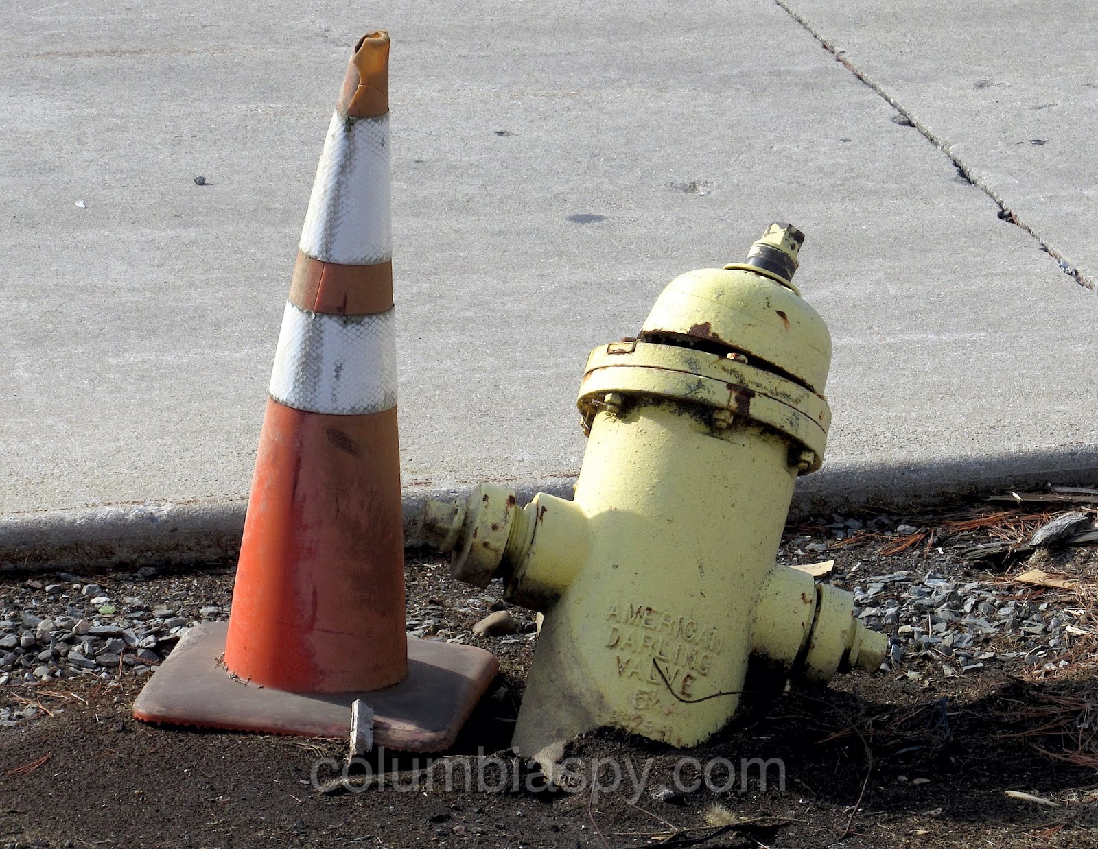 Busted fire hydrant being consoled by a traffic cone