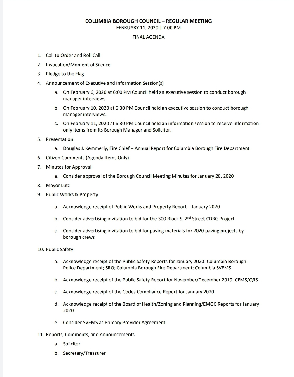 Agenda – Columbia Borough Council Meeting – February 11, 2020 Download the council packet HERE. Share this: Share on X (Opens in new window) X Share on Facebook (Opens in new window) Facebook More Share on Bluesky (Opens in new window) Bluesky Share on X (Opens in new window) X Like Loading... Related