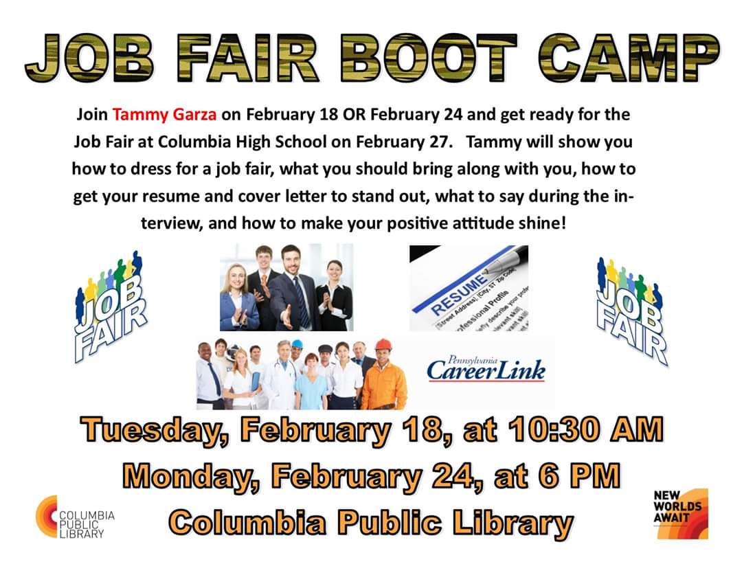 Job Fair Boot Camp at the Library Feb. 18 and 24 Share this: Share on X (Opens in new window) X Share on Facebook (Opens in new window) Facebook More Share on Bluesky (Opens in new window) Bluesky Share on X (Opens in new window) X Like Loading... Related