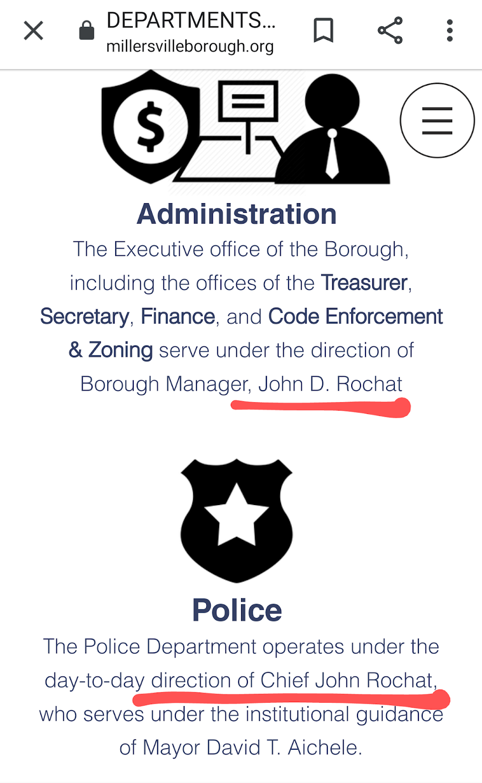 Rochat will report to the borough council in his role as borough manager, while Millersville Borough Mayor Richard M. Moriarty will supervise Rochat in his role as police chief, the mayor said.