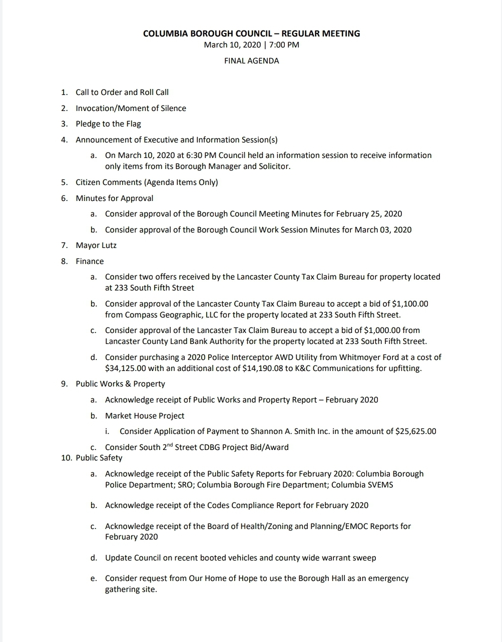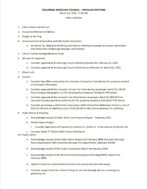 Agenda – Columbia Borough Council Meeting – March 10, 2020 Download the council packet HERE. Share this: Share on X (Opens in new window) X Share on Facebook (Opens in new window) Facebook More Share on Bluesky (Opens in new window) Bluesky Share on X (Opens in new window) X Like Loading... Related