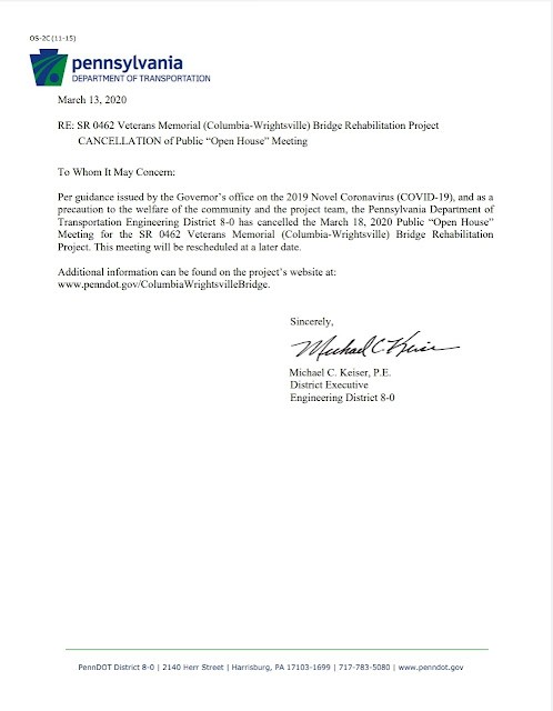 The Pennsylvania Department of Transportation planned to hold a Public “Open House Meeting on Wednesday, March 18, 2020 for the SR 462 Veterans Memorial (Columbia-Wrightsville) Bridge Rehabilitation Project. However, per guidance issued by the Governor’s office on the 2019 Novel Coronavirus (COVID-19), and as a precaution to the welfare of the community and the project team, this meeting has been cancelled and will be rescheduled at a later date.