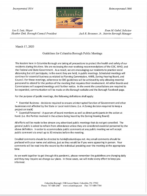 Columbia Borough meetings for essential business to continue with essential personnel only, public is asked to refrain from attending https://www.columbiapa.net/wp-content/uploads/2020/03/Guidelines-for-Columbia-Borough-Public-Meetings-03-17-2020.pdf Share this: Share on X (Opens in new window) X Share on Facebook (Opens in new window) Facebook More Share on Bluesky (Opens in new window) Bluesky Share on X (Opens in new window) X Like Loading... Related