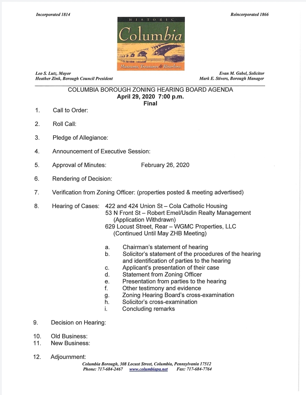 Agenda – Columbia Borough Zoning Hearing Board Meeting – April 29, 2020 This meeting will be livestreamed, according to the Columbia Borough Facebook page. Share this: Click to share on X (Opens in new window) X Click to share on Facebook (Opens in new window) Facebook More Click to share on Bluesky (Opens in new window) Bluesky Click to share on X (Opens in new window) X Like Loading... Related
