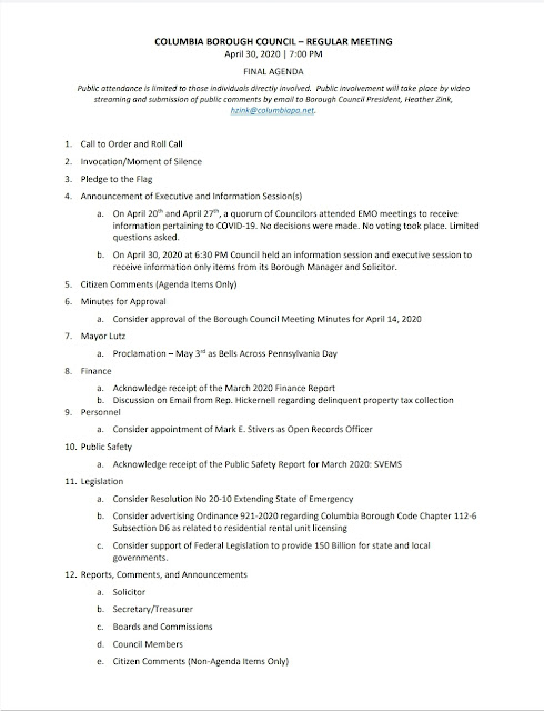 Agenda – Columbia Borough Council Meeting – April 30, 2020 Download the 94-page council packet HERE. Share this: Click to share on X (Opens in new window) X Click to share on Facebook (Opens in new window) Facebook More Click to share on Bluesky (Opens in new window) Bluesky Click to share on X (Opens in new window) X Like Loading... Related