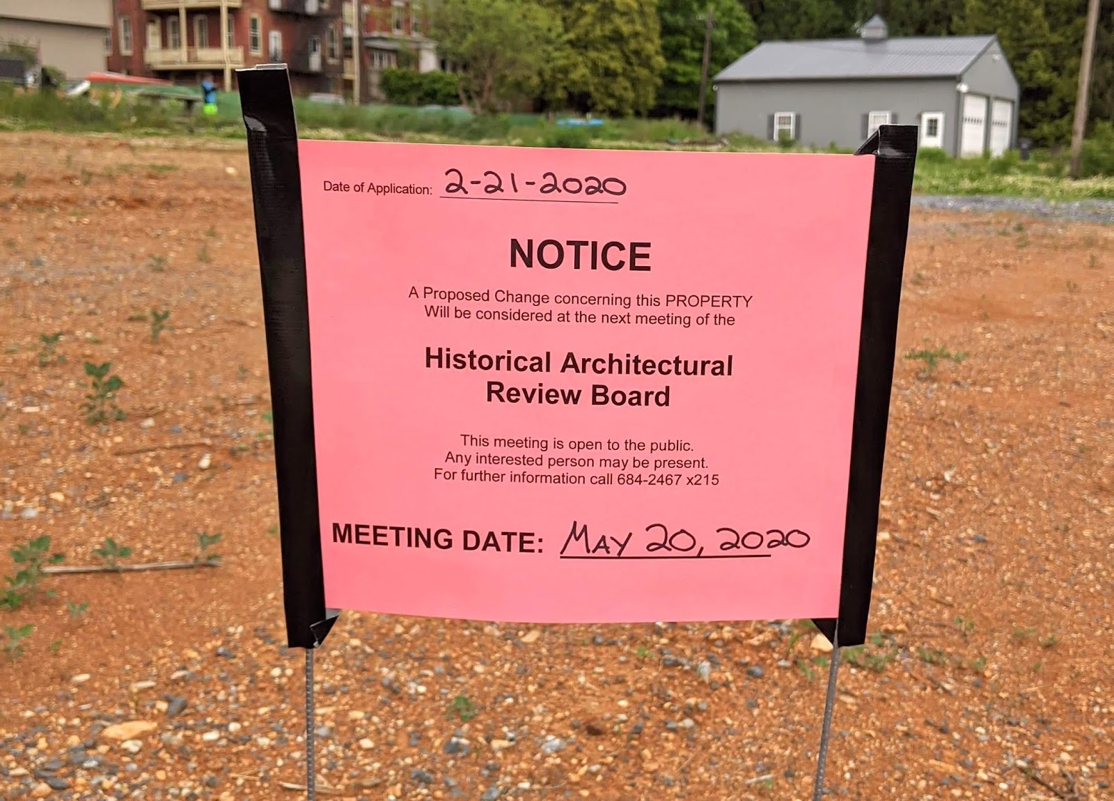 The photo of the notice shown above recently appeared at 134 Locust Street, a vacant lot at the intersection of Locust Street and Bank Avenue. The notice announces a May 20 meeting of Columbia Borough’s Historic Architectural Review Board (HARB) to consider a proposed change to the property. The notice does not specify a time or address for the meeting, although HARB meetings are typically held at 7 p.m. on the third Wednesday of the month at the municipal building (308 Locust Street). No agenda or other information about the meeting appears on the Columbia Borough website or Facebook page, except for a legal advertisement dated 12/26/19 HERE.