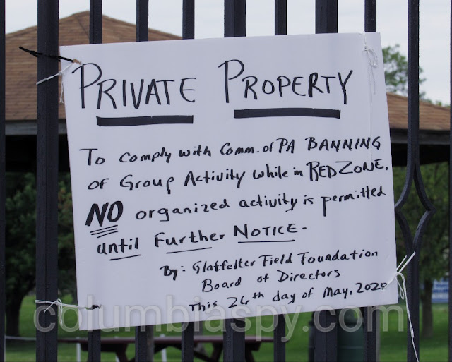 Columbia Spy received a report of a pop-up car show that occurred at Glatfelter’s Field on Sunday night at about 8 p.m. As the sign above indicates, the park is closed to any group activity while the county is still in the “red zone.” No organized activity is permitted until final notice. There is no apparent connection between the car show and the graffiti.