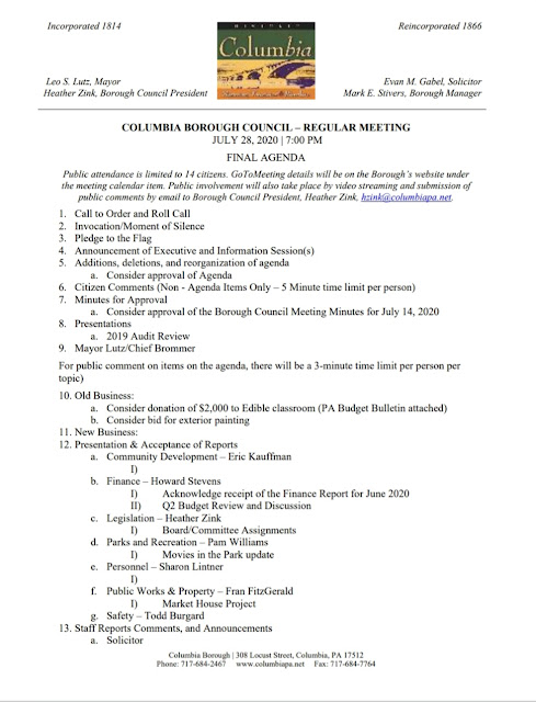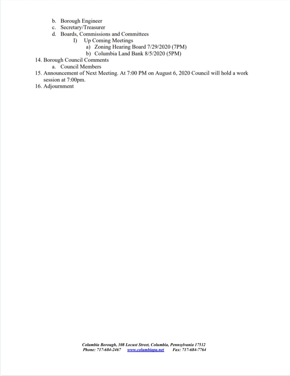 Agenda – Columbia Borough Council Meeting – July 28, 2020 Download the 288-page council packet HERE Share this: Share on X (Opens in new window) X Share on Facebook (Opens in new window) Facebook More Share on Bluesky (Opens in new window) Bluesky Share on X (Opens in new window) X Like Loading... Related