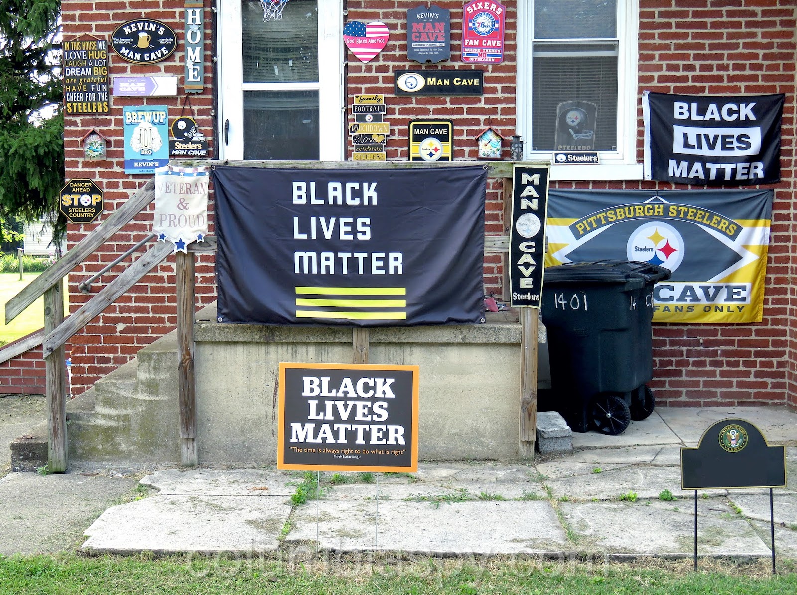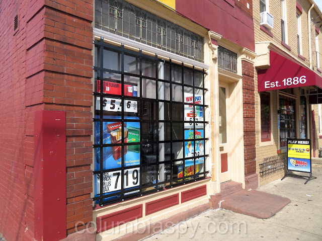 The window next to the entrance door (far right, under the awning) was broken out on June 5, and a grate has been added there, also.