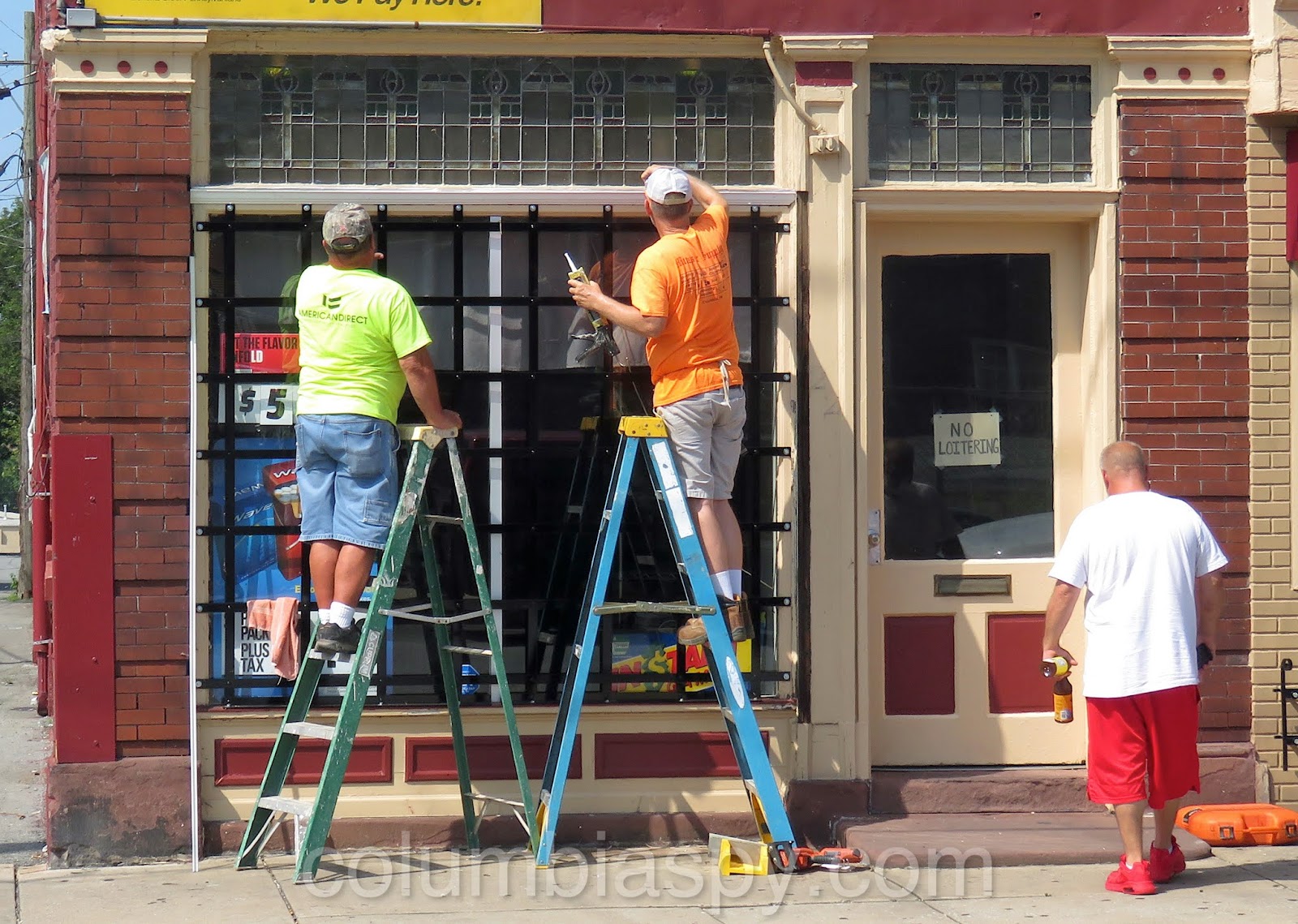 Workers installed a window grate at Stover’s to help prevent further break-ins at the store.