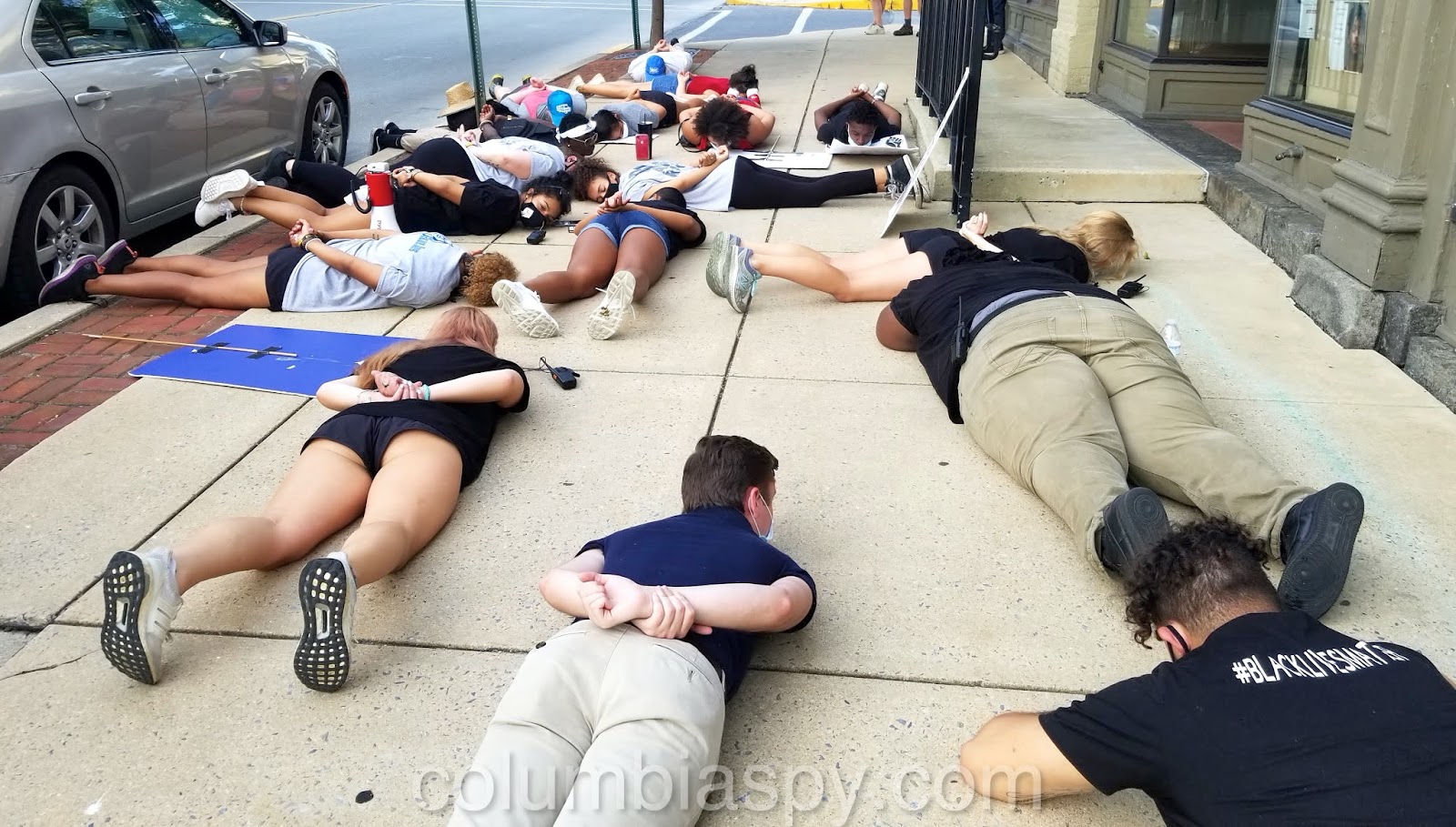 The group protested in front of the police station (above) before lying on the sidewalk (shown below) for 8 minutes and 46 seconds in observance of the amount of time that a Minneapolis police officer knelt on the neck of George Floyd, a black man, causing his death.