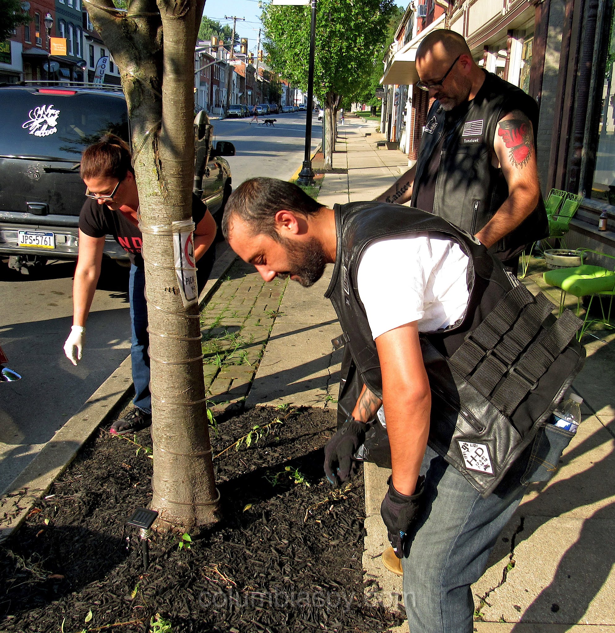 Nine members of the local chapter of the Infamous Ryders motorcycle club cleaned up trash on several blocks of Locust Street Monday evening. “It’s a way of giving back to the community,” chapter president Drew Nyce said. The club plans to do such clean-ups once a month, according to Nyce. (Nyce, a Columbia resident, is also owner of Nyce Tattoos, which Columbia Spy reported on HERE.)