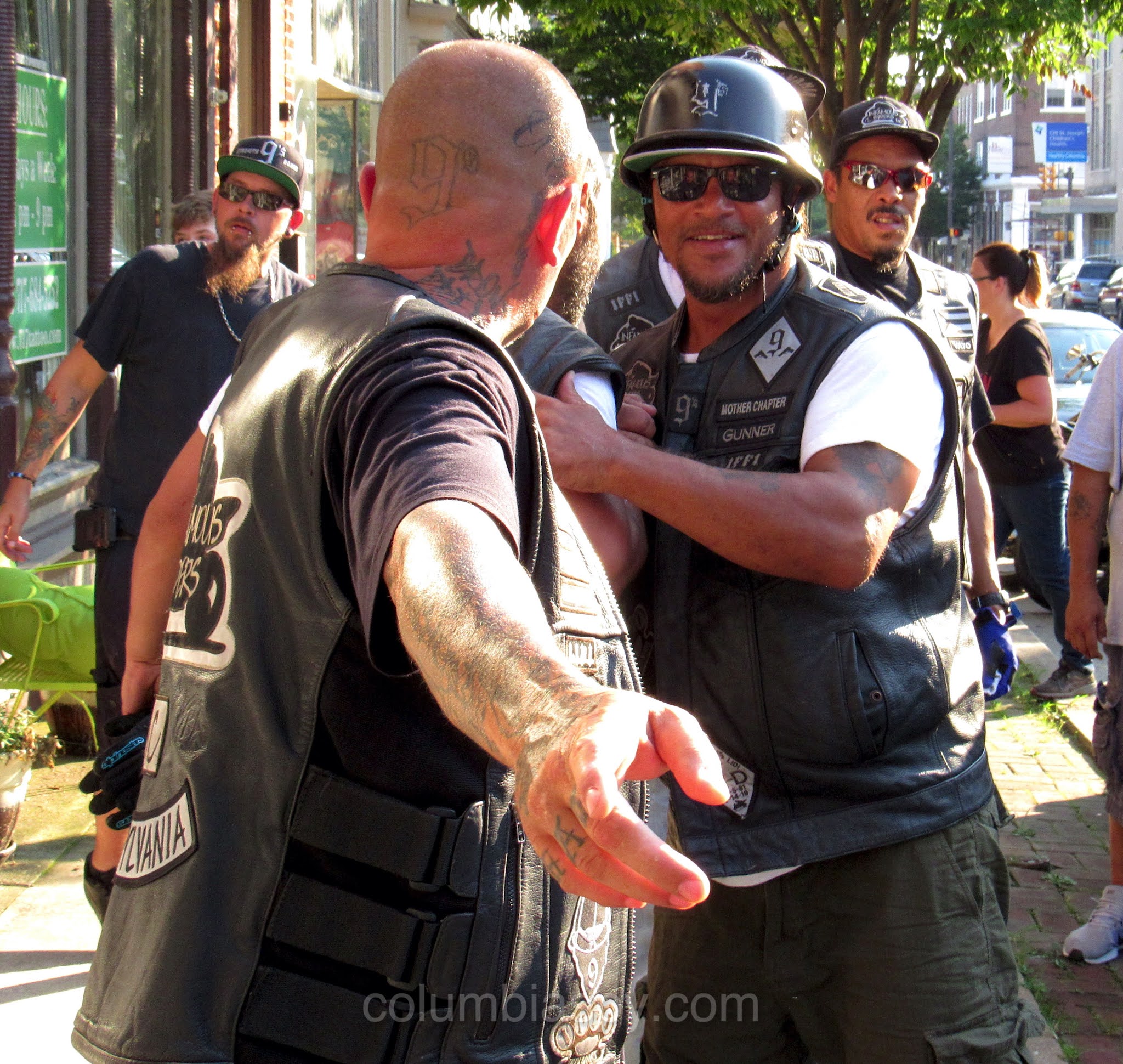 Nine members of the local chapter of the Infamous Ryders motorcycle club cleaned up trash on several blocks of Locust Street Monday evening. “It’s a way of giving back to the community,” chapter president Drew Nyce said. The club plans to do such clean-ups once a month, according to Nyce. (Nyce, a Columbia resident, is also owner of Nyce Tattoos, which Columbia Spy reported on HERE.)