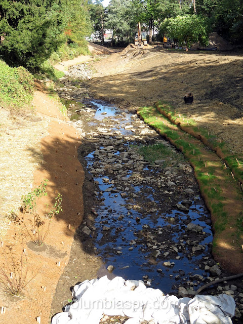 A riparian buffer runs along a stretch of Shawnee Run and will help stabilize the bank, prevent erosion, and improve drainage.