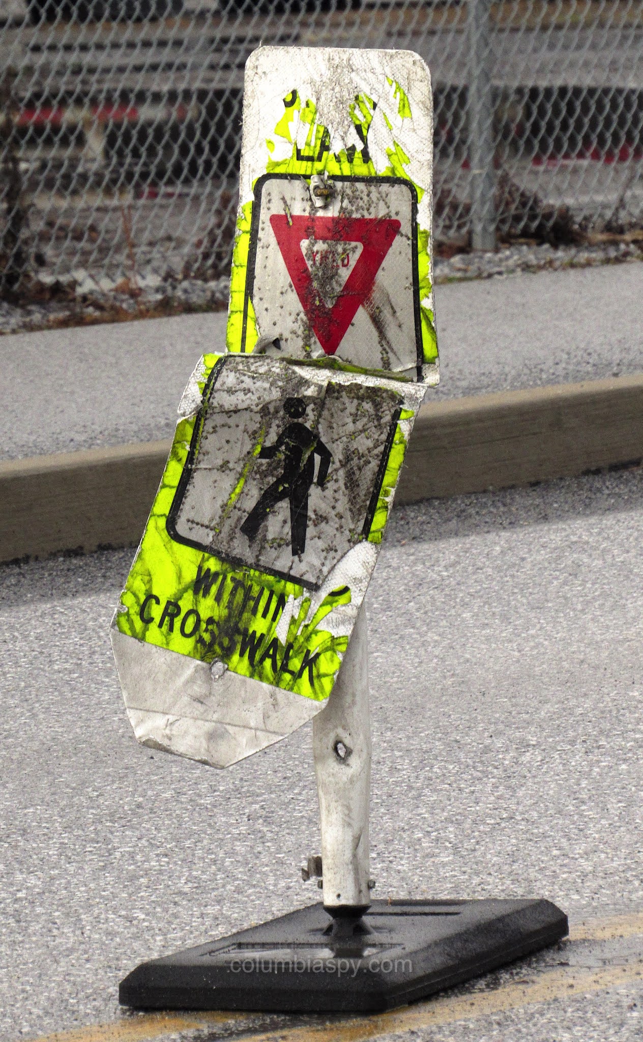 This crossing sign near Front and Bridge seems to be a favorite target for vehicles.
