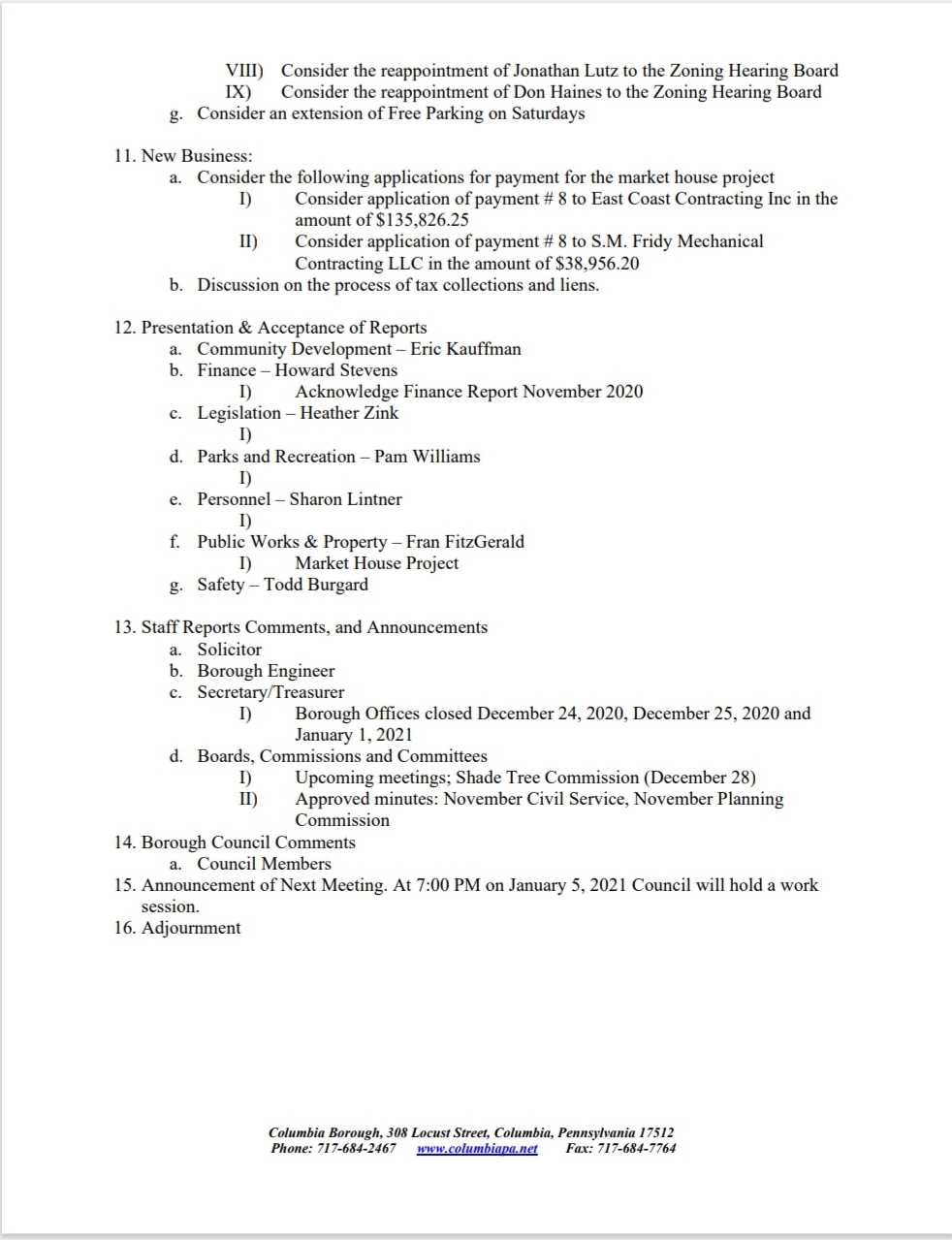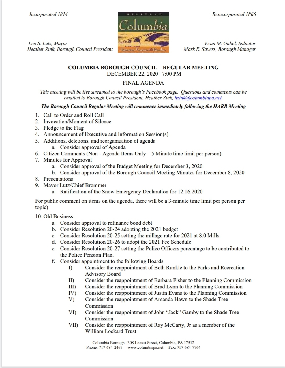 Agenda – Columbia Borough Council Meeting – December 22, 2020 Download the 128-page meeting packet HERE. PFM Refinancing Analysis is HERE. Share this: Share on X (Opens in new window) X Share on Facebook (Opens in new window) Facebook More Share on Bluesky (Opens in new window) Bluesky Share on X (Opens in new window) X Like Loading... Related