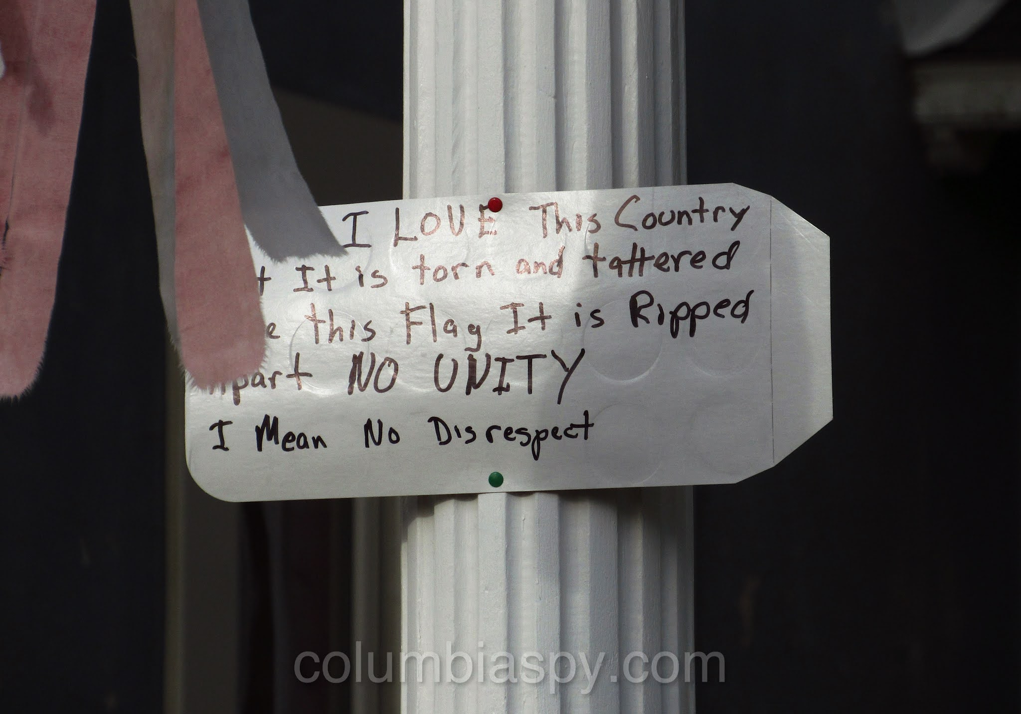 The note reads: “I love this country but it is torn and tattered like this flag it is ripped apart. No unity. I mean no disrespect.”