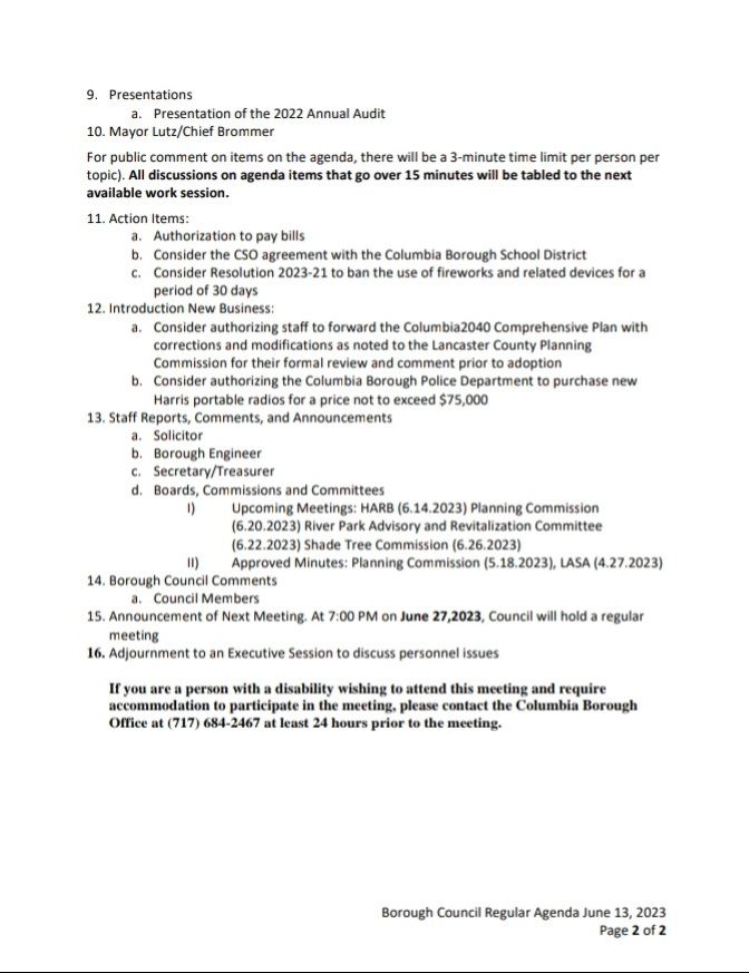 Agenda – Columbia Borough Council Meeting – June 13, 2023 The meeting packet is HERE. Share this: Share on X (Opens in new window) X Share on Facebook (Opens in new window) Facebook More Share on Bluesky (Opens in new window) Bluesky Share on X (Opens in new window) X Like Loading... Related