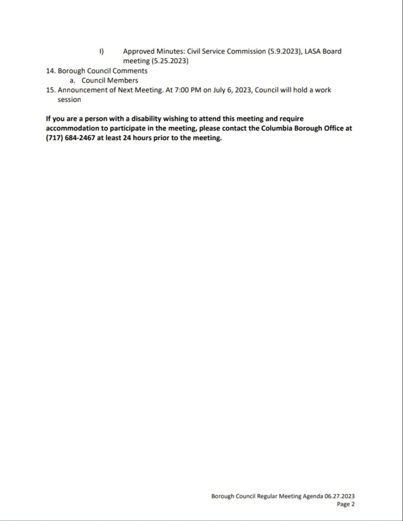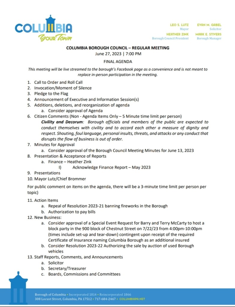 Agenda – Columbia Borough Council Meeting – June 27, 2023 The meeting packet is HERE. Share this: Share on X (Opens in new window) X Share on Facebook (Opens in new window) Facebook More Share on Bluesky (Opens in new window) Bluesky Share on X (Opens in new window) X Like Loading... Related