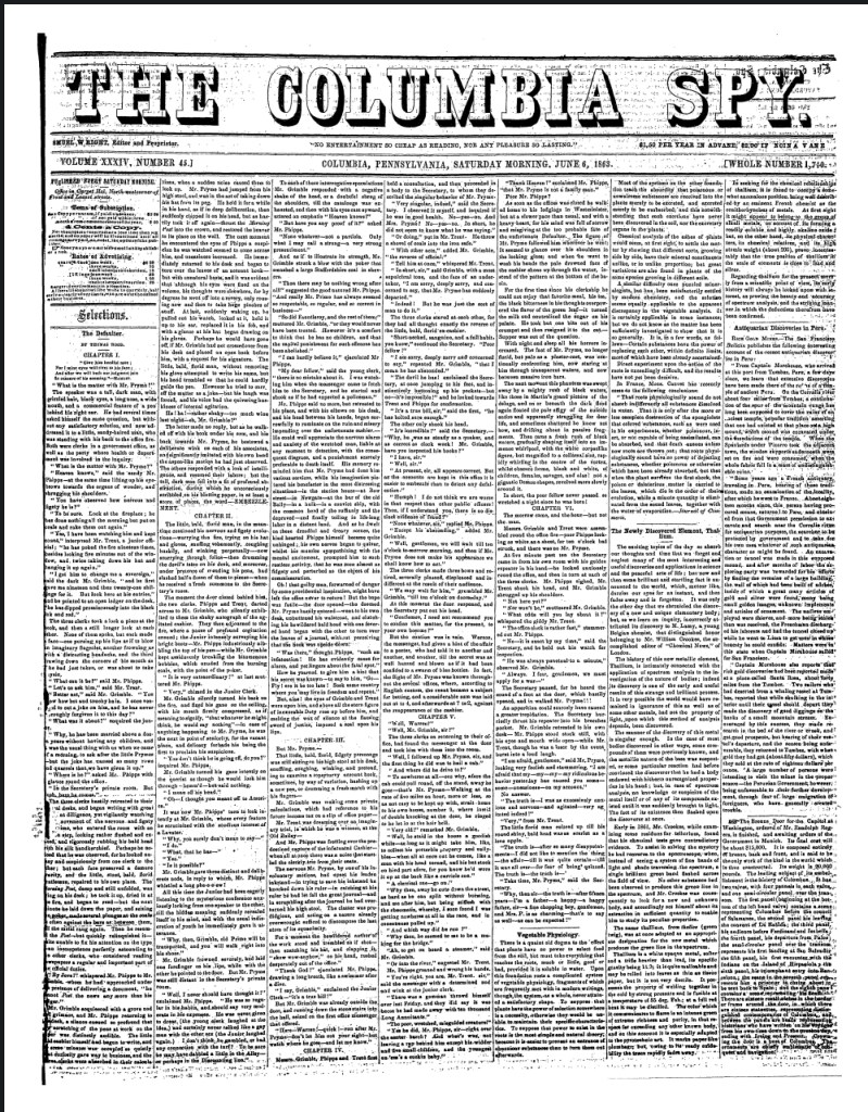 Shown below is the front page of the June 6, 1863 edition of The Columbia Spy (less than a month before the Battle of Gettysburg). A somewhat more legible version of the page, as well as four other pages and the text of this edition can be found HERE.