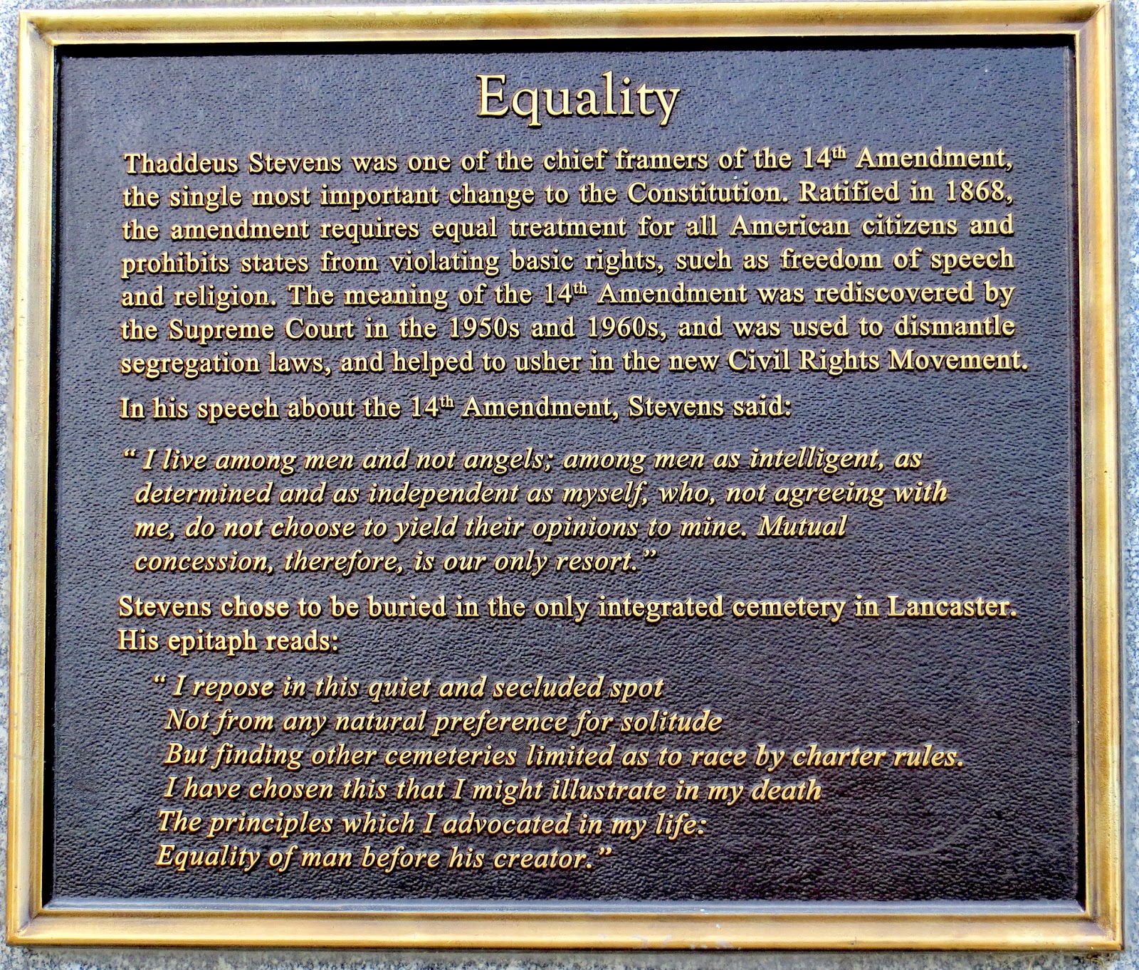 “I repose in this quiet and secluded spot, not from any natural preference for solitude; but finding other cemeteries limited as to race, by charter rules, I have chosen this that I might illustrate in my death the principles which I advocated through a long life, equality of man before the Creator.“