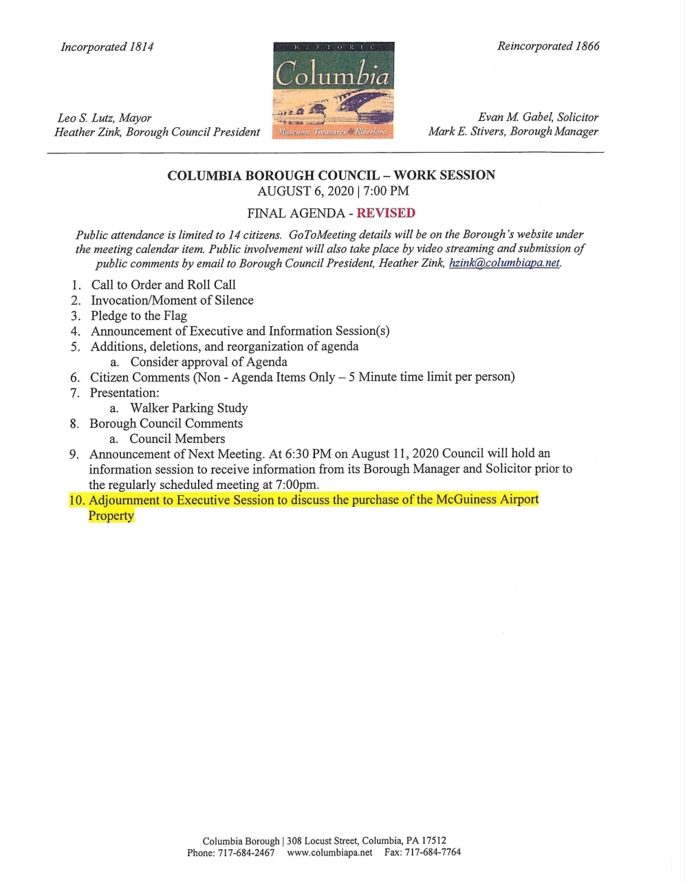 REVISED Agenda – Columbia Borough Council Work Session – August 6, 2020